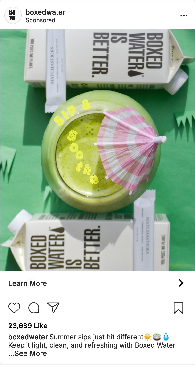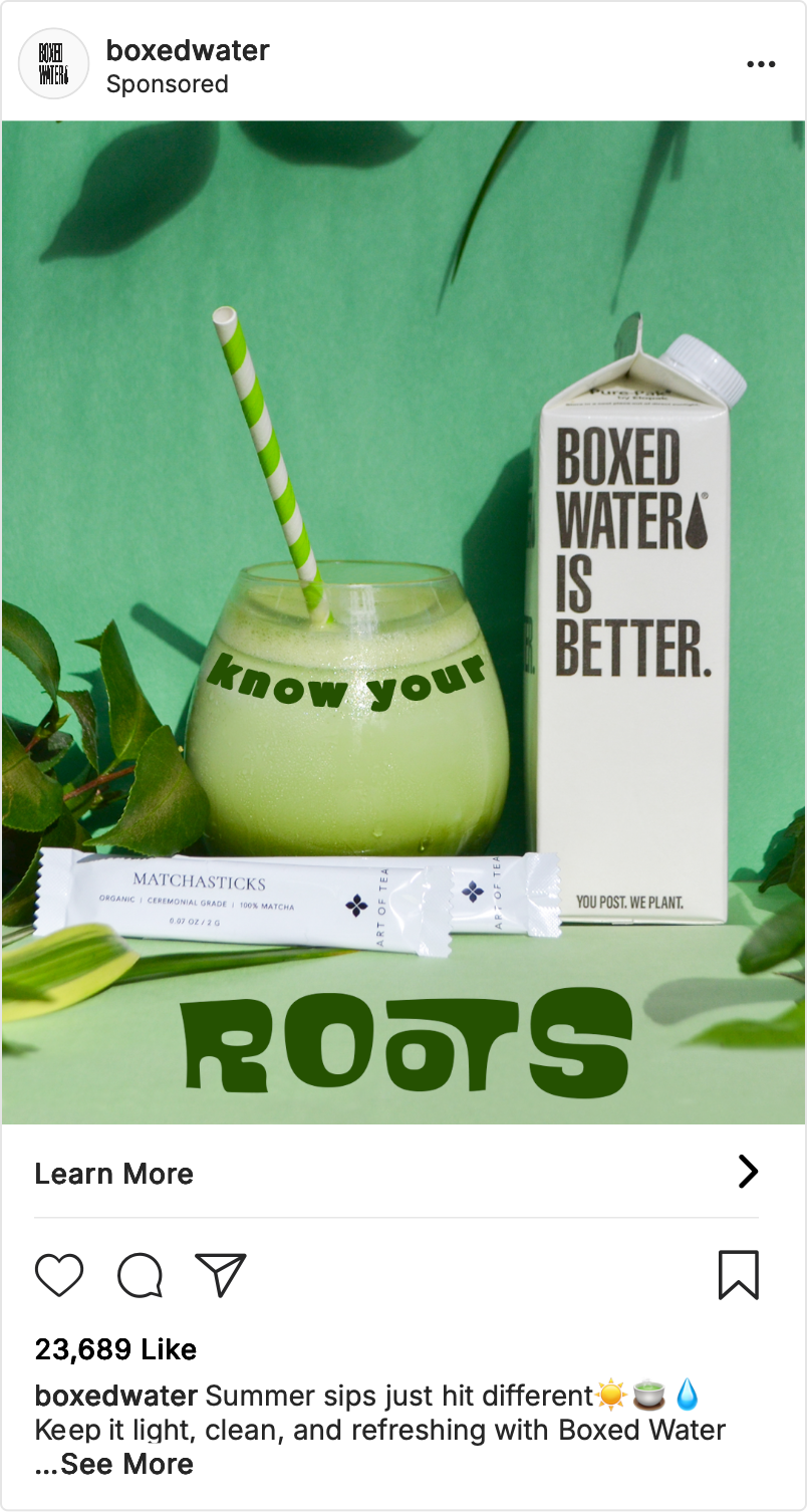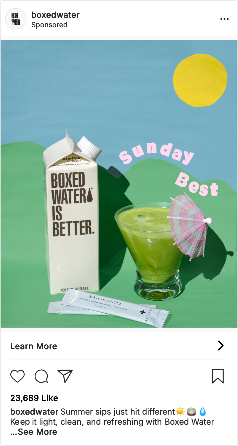 This social media ad creates a visually engaging scene using Boxed Water products alongside matcha to highlight the brand’s clean, eco-conscious identity. I used construction paper to set the scene, incorporating plants, and a pastel color palette to evoke a fresh and modern aesthetic. Through photography, I captured the interplay of color, texture, and lighting to emphasize the simplicity and sustainability of the packaging, while the addition of matcha reinforced themes of wellness. The final images present Boxed Water as both a lifestyle choice and a visually distinctive product.